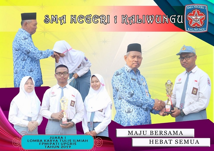Masih dari cabang KIR, pada tanggal 8 Oktober 2019 tim yang beranggotakan M. Kuat Mulyanto (XII MIPA 5), Shinta Muhadifa Aisyah (X MIPA 2), dan Dian Putri Maharani (X MIPA 5) menjadi jawara utama di FPMIPATI UPGRIS. Dengan bangga mereka berpose bersama sang pembimbing tercinta Bp. Fahrurrozi, S.Si.