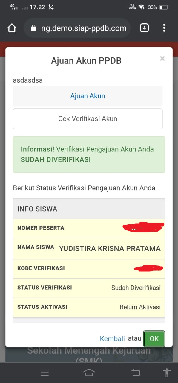 2. Proses pengajuan Akun/Token menunggu hasil verifikasi dan validasi operator sekolah yang dituju (SMA yang dipilih). Berkas yang diverifikasi meliputi: