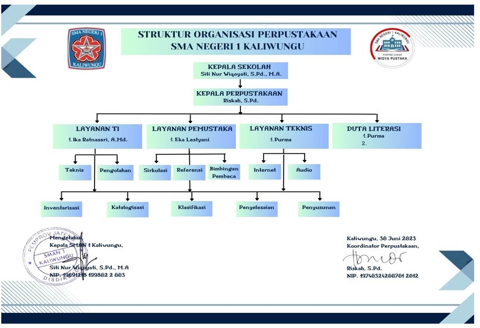 Struktur organisasi perpustakaan Widya Pustaka SMA Negeri 1 Kaliwungu adalah sebagai berikut: